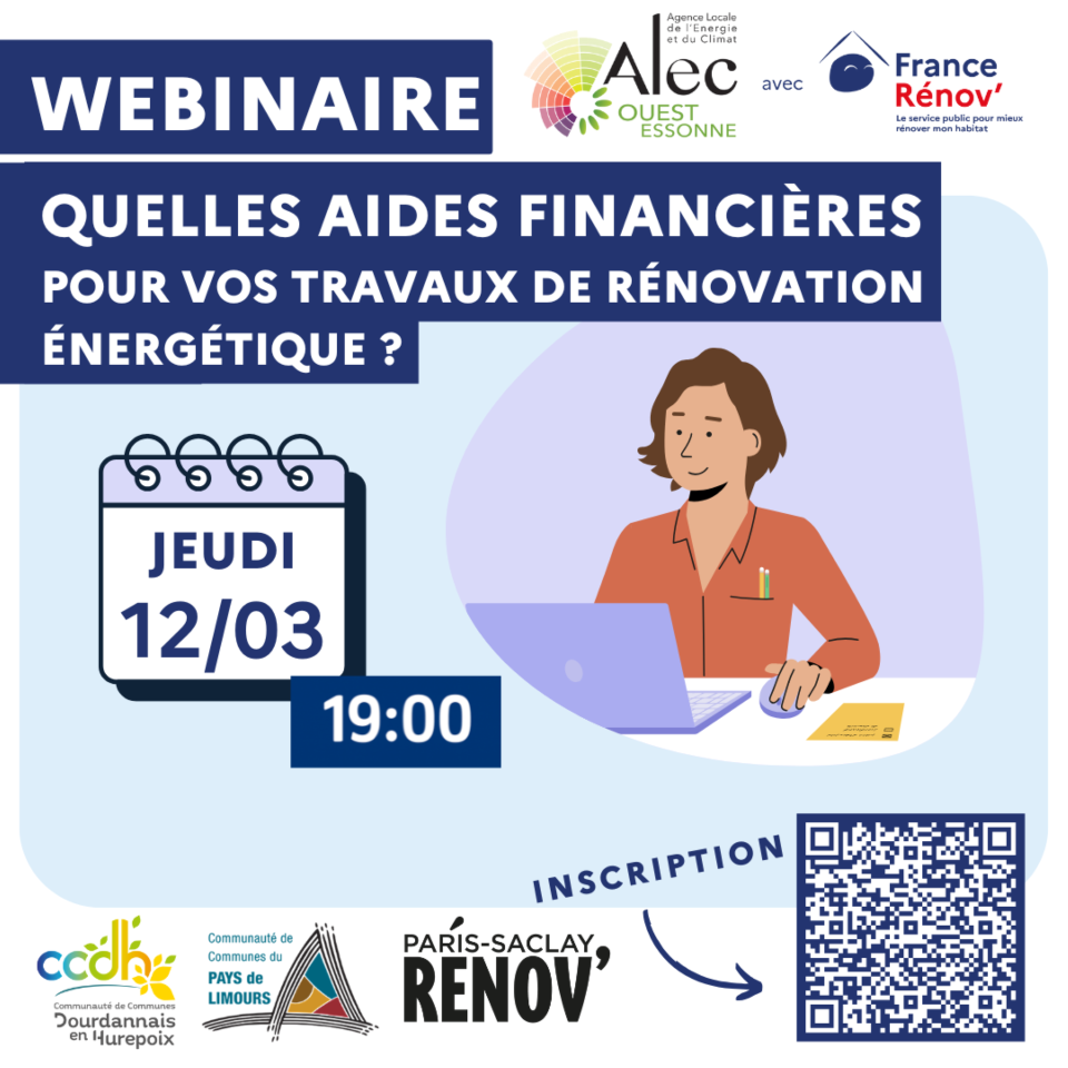 Ce webinaire, animé par l’ALEC Ouest Essonne, votre espace Conseil France Rénov’, vous permettra d’identifier en un clin d’œil les principales aides à l’échelle locale ou nationale dont vous pourrez bénéficier.